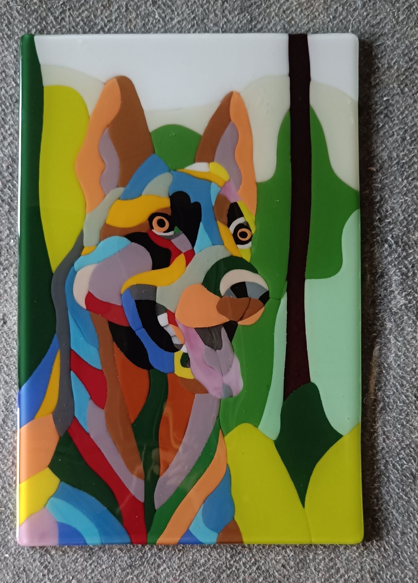 Mijn nieuwe stijl is een fusing werk in de hard edge kunst. Hard Edge kunst kenmerkt zich door kleurvlakken die gescheiden zijn door scherpe lijnen. Ik vind de duidelijke overgangen en de heldere kleuren erg mooi en leuk om te maken. Ik heb er nu 4 gemaakt en heb alweer een nieuw ontwerp in mijn hoofd. Deze staan in de linkerkolom hierboven.
